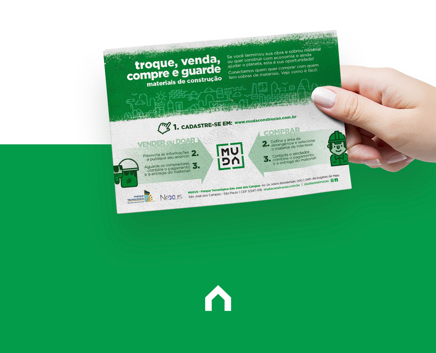 Com o objetivo de dar destino certo aos resíduos das construções civis e impactar positivamente a população com produtos mais baratos, dois jovens engenheiros e empreendedores procuraram a Jeter Design para desenvolver a identidade visual da marca MUDA.